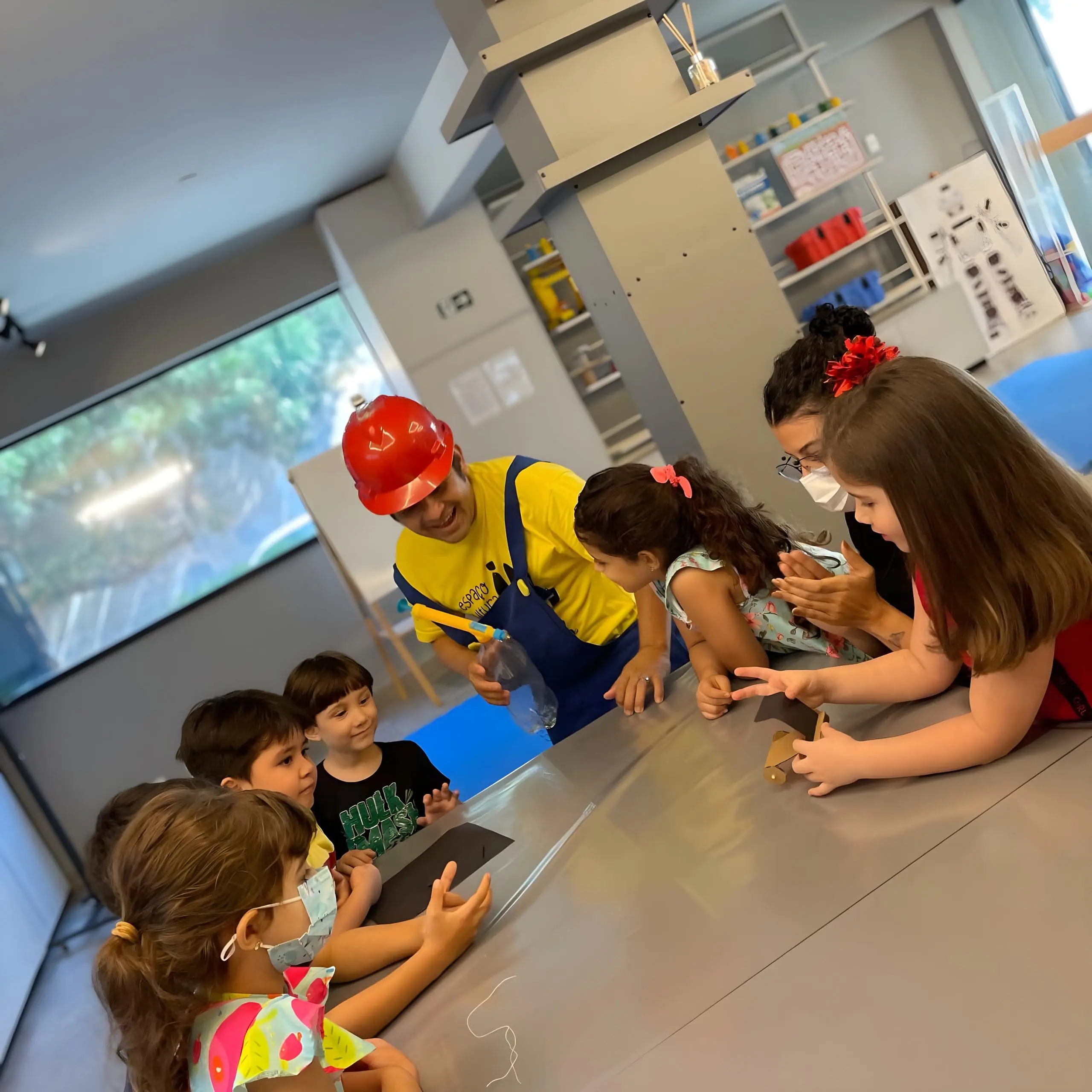 atividade propõe um ambiente que simula um laboratório de experiências de ciências. Seguindo o conceito maker, as crianças são incentivadas a observar como se comportam objetos diversos.